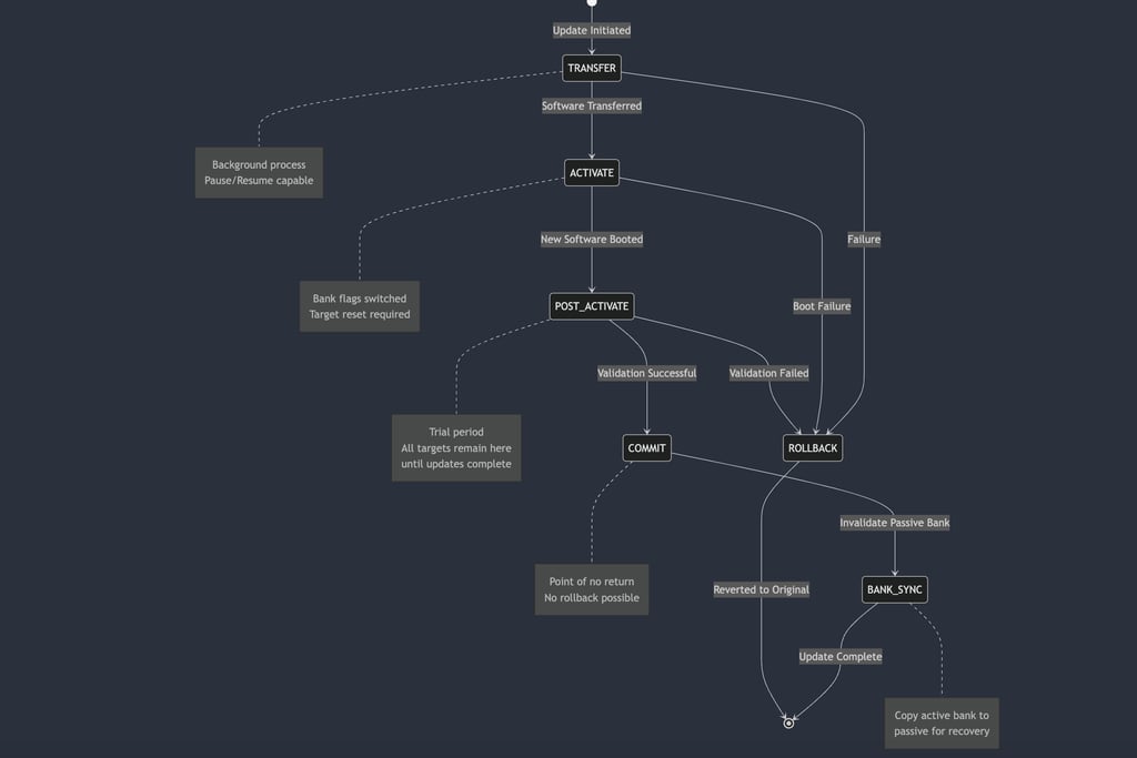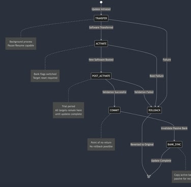 After activation, the new software enters a trial period to verify proper functionality. This safety window allows for observation before final commitment. A key architectural decision was to have all targets remain in post-activation until every component's transfer and activation is complete, ensuring system-wide consistency.